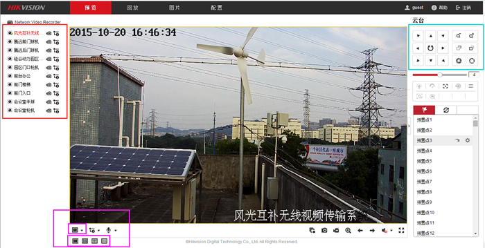 操作指导: 1、登陆后,双击左侧红框内文字,就可查看相应的监控摄像头影像。 2、点击左下角紫色框内的按键,选择屏幕显示大小。 3、点击右侧蓝色框内的按键,能控制监控摄像头的转向,方向键中间的按键是自动旋转键。